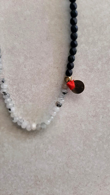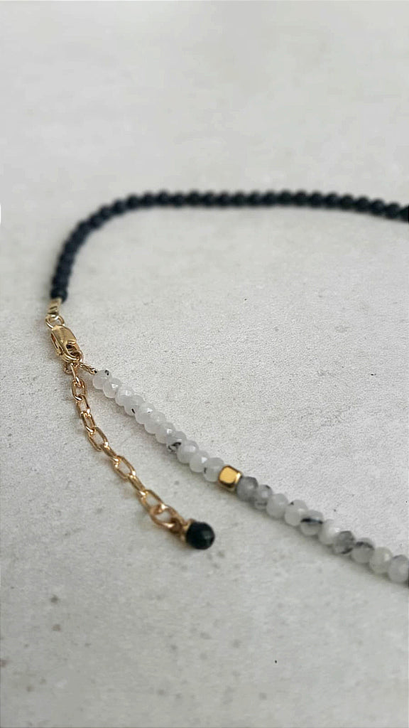 שרשרת אסימטרית קצרה משולבת אבני חן בגוונים של שחור מט ,לבן וגולד פילד.